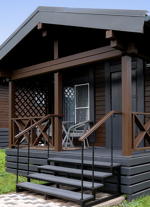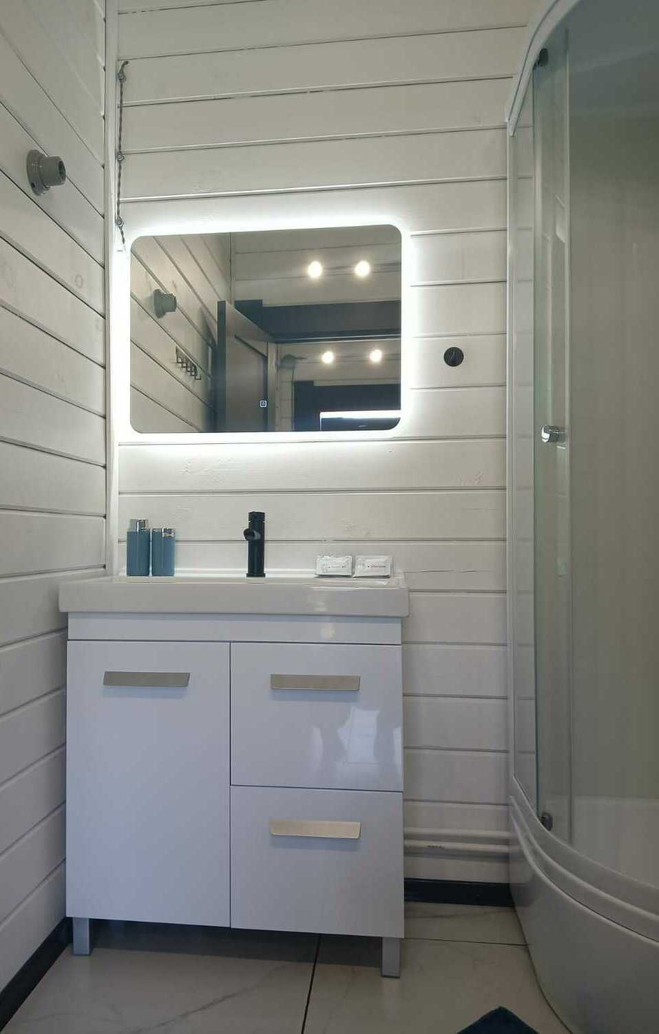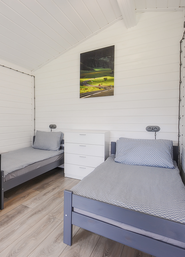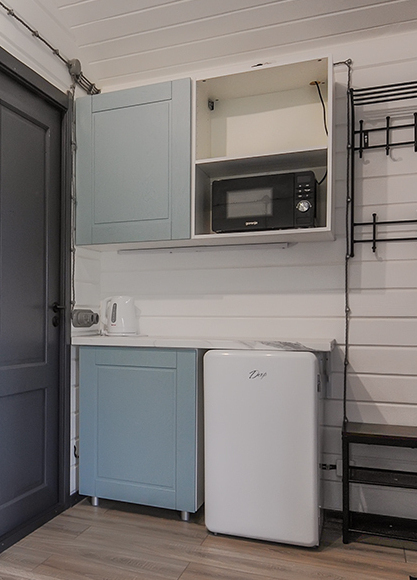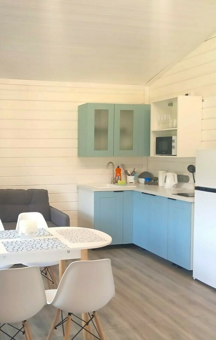 Просторные домики-студии на 2х-3х человек круглогодичного проживания. Площадь дома 20м2 + терраса 6м2. Размещение на выбор. Две односпальные кровати либо двуспальная кровать, комод, диван-кровать 1,5 местный, стол, кухонная зона (холодильник, чайник, микроволновка, посуда, столовые приборы) и санузел. Постельное белье, комплек поленец, набор для душа. В домике установлен электрический конвектор. Санузел оборудован теплым полом, электрическим полотенцесушителем, бойлером, душевой кабиной, есть фен. Так же в домике размещен телевизор с функцией smartTV, бесплатный WI-FI.