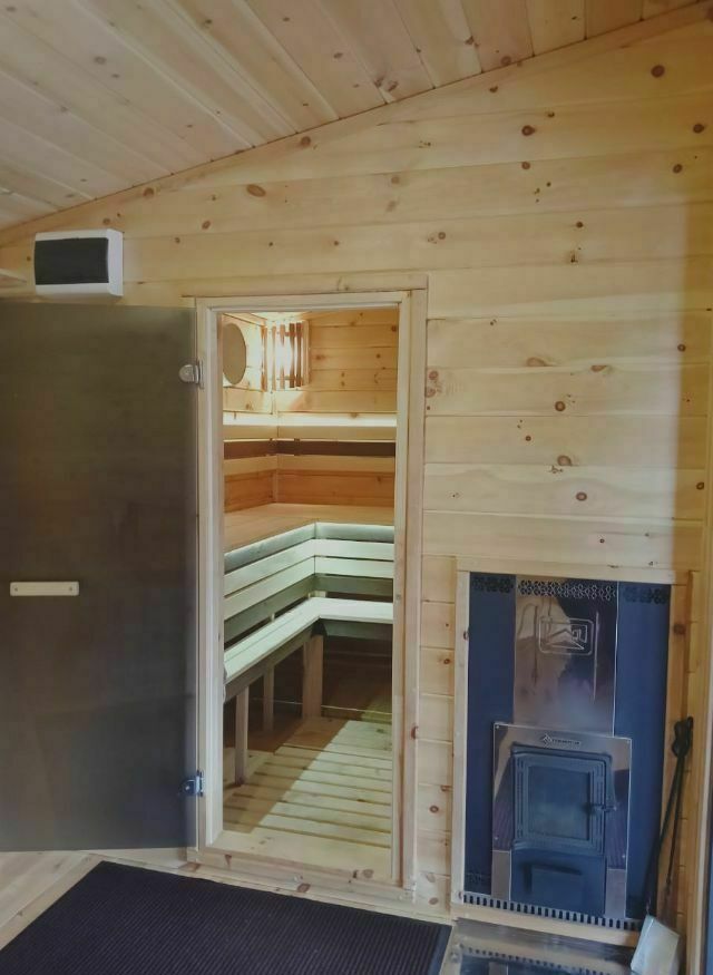 Просторные трехкомнатные дома на 5-6 человек круглогодичного проживания. Площадь дома 50м2 + терраса 21м2. В доме две комнаты площадью 10м2 каждая, большая кухня-гостиная площадью 20м2, общий сан узел и прихожая. Первая спальня оборудована двумя односпальными кроватями, комодом, столом и небольшой открытой гардеробной, во второй спальне двуспальная кровать 160х200, прикроватные тумбочки, небольшая открытая гардеробная. В кухне-гостиной размещен диван-кровать с 2х местным спальным местом, стол, стулья и кухонная зона (холодильник, чайник, микроволновка, посуда, столовые приборы, электрическая варочная панель), телевизор с функцией смартТВ. В санузле установлена душевая кабина, раковина с тумбой, зеркало с подсветкой, электрический полотенце сушитель, есть фен. В доме отдельный бойлер, своя система отопления. Постельное белье, комплек поленец для всех постояльцев, набор для душа. Санузел оборудован теплым полом