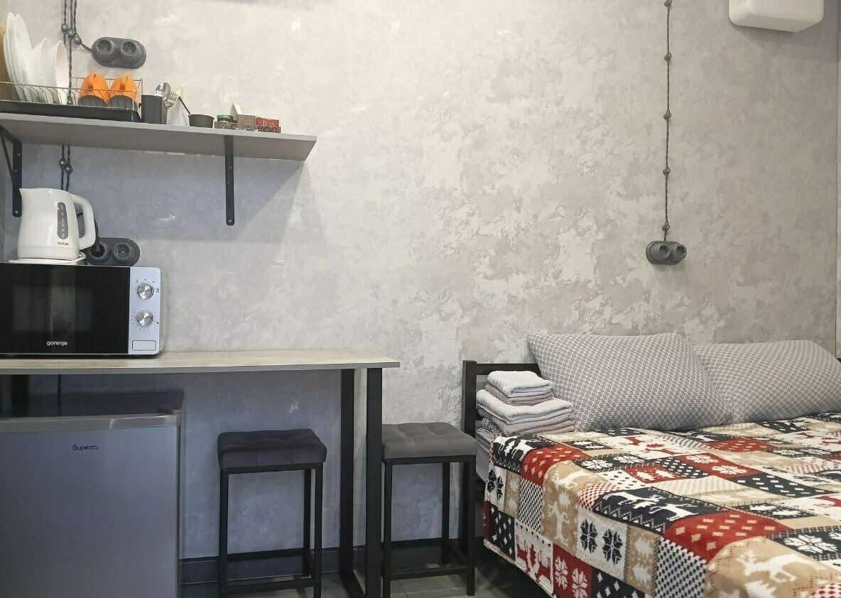 Просторные домики-студии на 2х-3х человек круглогодичного проживания. Площадь дома 20м2 + терраса 6м2. Размещение на выбор. Две односпальные кровати либо двуспальная кровать, комод, диван-кровать 1,5 местный, стол, кухонная зона (холодильник, чайник, микроволновка, посуда, столовые приборы) и санузел. Постельное белье, комплек поленец, набор для душа. В домике установлен электрический конвектор. Санузел оборудован теплым полом, электрическим полотенцесушителем, бойлером, душевой кабиной, есть фен. Так же в домике размещен телевизор с функцией smartTV.