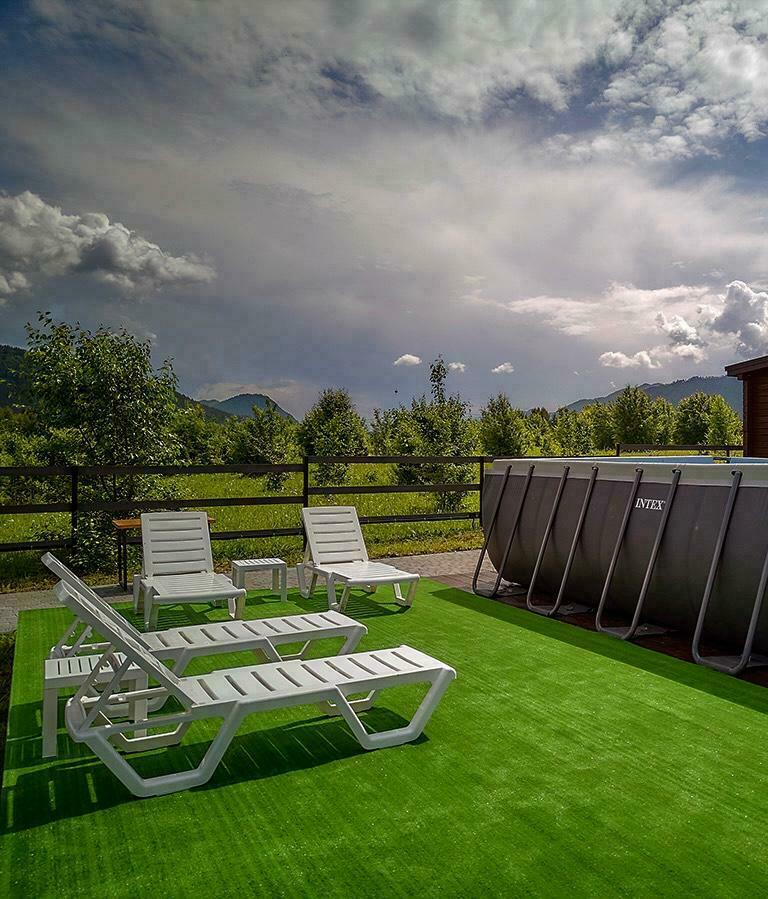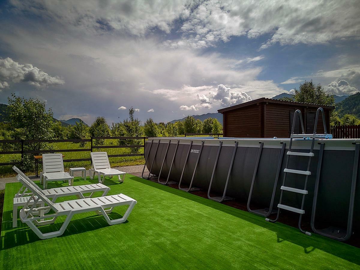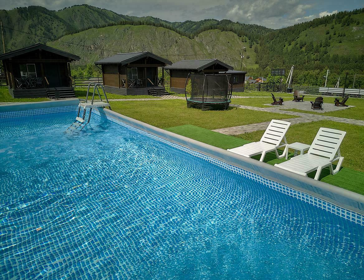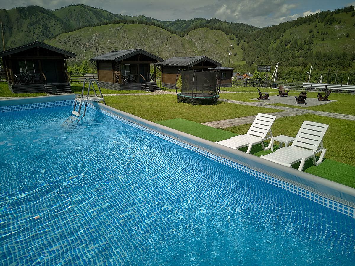 Два бассейна 7,5х5м с чистой прохладной водой и видом на горы порадут в жаркие летние дни и не оставят равнодушным ни одного посетителя базы.