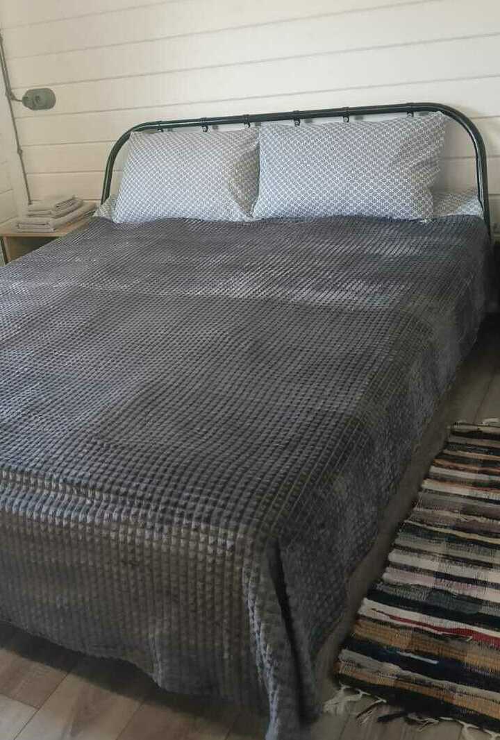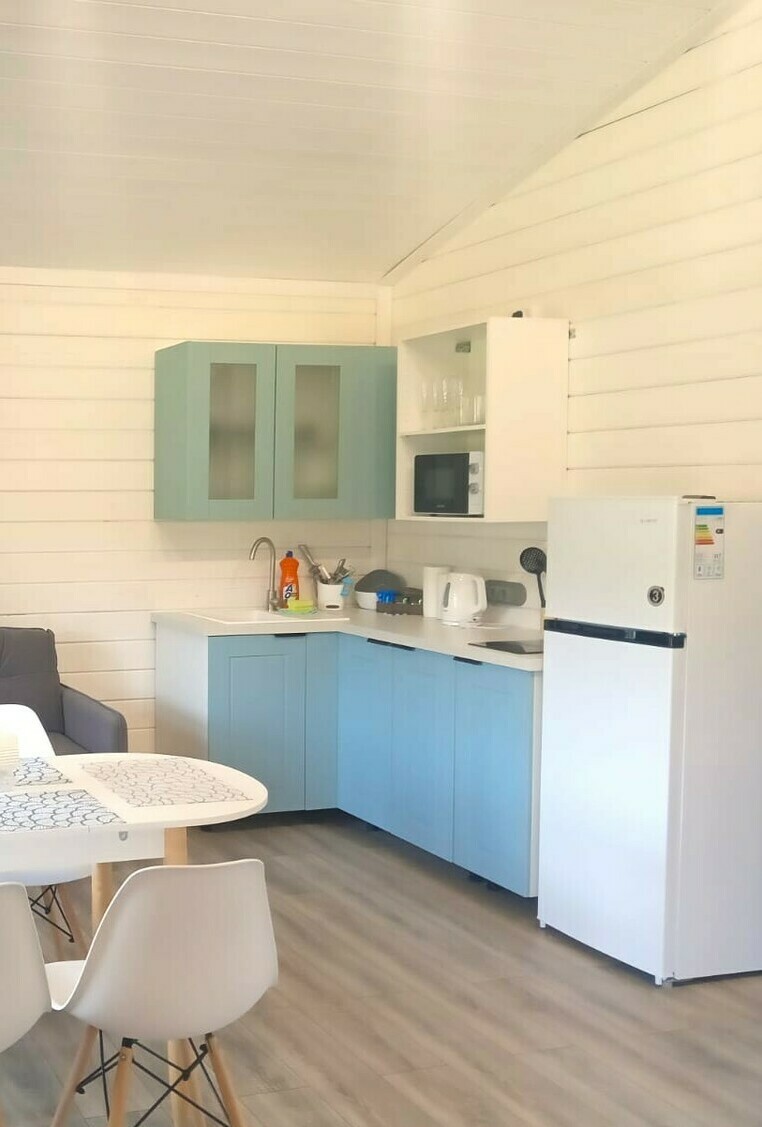 Просторные трехкомнатные дома на 5-6 человек круглогодичного проживания. Площадь дома 50м2 + терраса 21м2. В доме две комнаты площадью 10м2 каждая, большая кухня-гостиная площадью 20м2, общий сан узел и прихожая. Первая спальня оборудована двумя односпальными кроватями, комодом, столом и небольшой открытой гардеробной, во второй спальне двуспальная кровать 160х200, прикроватные тумбочки, небольшая открытая гардеробная. В кухне-гостиной размещен диван-кровать с 2х местным спальным местом, стол, стулья и кухонная зона (холодильник, чайник, микроволновка, посуда, столовые приборы, электрическая варочная панель), телевизор с функцией смартТВ. В санузле установлена душевая кабина, раковина с тумбой, зеркало с подсветкой, электрический полотенце сушитель, есть фен. В доме отдельный бойлер, своя система отопления. Постельное белье, комплек поленец для всех постояльцев, набор для душа. Санузел оборудован теплым полом.