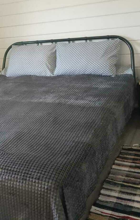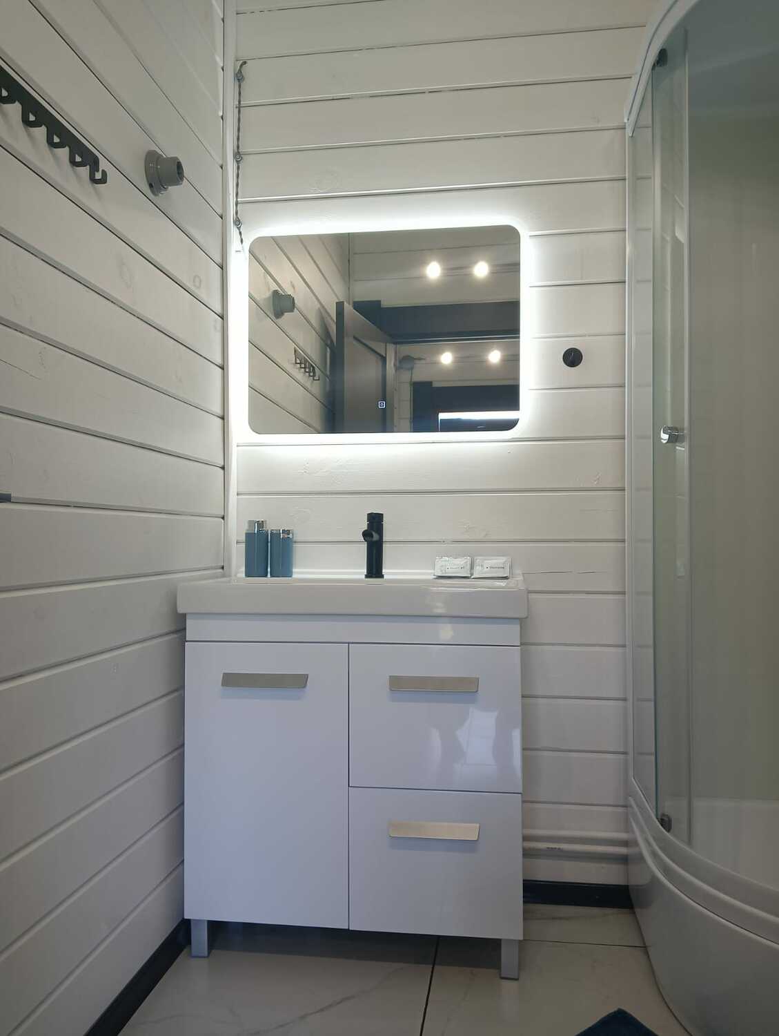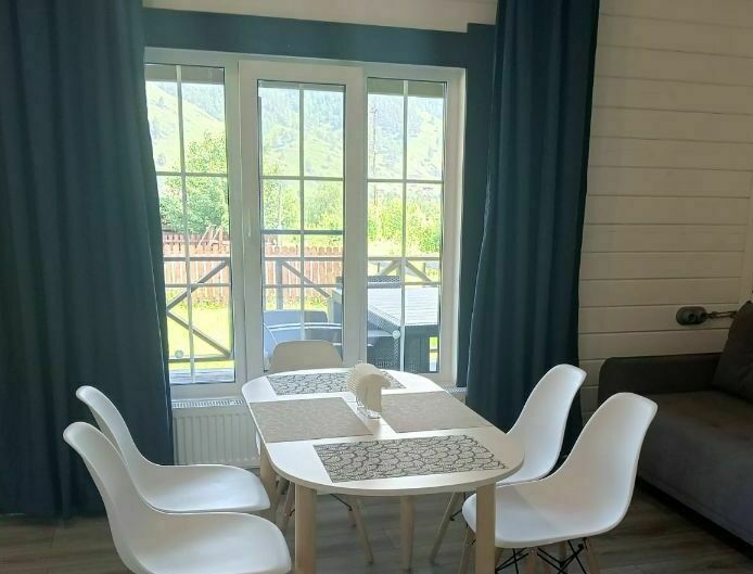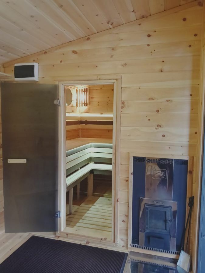Просторные трехкомнатные дома на 5-6 человек круглогодичного проживания. Площадь дома 50м2 + терраса 21м2. В доме две комнаты площадью 10м2 каждая, большая кухня-гостиная площадью 20м2, общий сан узел и прихожая. Первая спальня оборудована двумя односпальными кроватями, комодом, столом и небольшой открытой гардеробной, во второй спальне двуспальная кровать 160х200, прикроватные тумбочки, небольшая открытая гардеробная. В кухне-гостиной размещен диван-кровать с 2х местным спальным местом, стол, стулья и кухонная зона (холодильник, чайник, микроволновка, посуда, столовые приборы, электрическая варочная панель), телевизор с функцией смартТВ. В санузле установлена душевая кабина, раковина с тумбой, зеркало с подсветкой, электрический полотенце сушитель, есть фен. В доме отдельный бойлер, своя система отопления. Постельное белье, комплек поленец для всех постояльцев, набор для душа. Санузел оборудован теплым полом