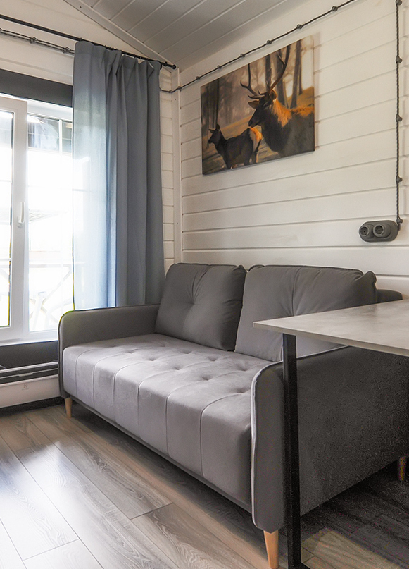 Просторные однокомнатные домики на 2х-3х человек круглогодичного проживания. Площадь дома 20м2 + терраса 6м2. Размещение на выбор. Две односпальные кровати либо двуспальная кровать, комод, диван-кровать 1,5 местный, стол, кухонная зона (холодильник, чайник, микроволновка, посуда, столовые приборы) и санузел. Постельное белье, комплек поленец, набор для душа. В домике установлен электрический конвектор. Санузел оборудован теплым полом, электрическим полотенцесушителем, бойлером, душевой кабиной, есть фен. Так же в домике размещен телевизор с функцией smartTV, бесплатный WI-FI.