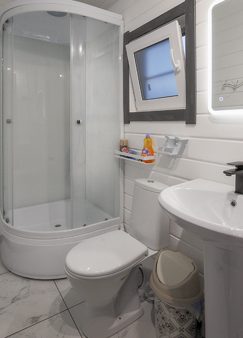 Просторные трехкомнатные дома на 5-6 человек круглогодичного проживания. Площадь дома 50м2 + терраса 21м2. В доме две комнаты площадью 10м2 каждая, большая кухня-гостиная площадью 20м2, общий сан узел и прихожая. Первая спальня оборудована двумя односпальными кроватями, комодом и небольшой открытой гардеробной, во второй спальне о двуспальная кровать 160х200, прикроватные тумбочки, небольшая открытая гардеробная и туалетный стол. В кухне-гостиной размещен диван-кровать с 2х местным спальным местом, стол, стулья и кухонная зона (холодильник, чайник, микроволновка, посуда, столовые приборы, электрическая варочная панель), телевизор с функцией смартТВ. В санузле установлена душевая кабина, раковина с тумбой, зеркало с подсветкой, электрический полотенце сушитель, есть фен. В доме отдельный бойлер. Постельное белье, комплек поленец для всех постояльцев, набор для душа. Санузел оборудован теплым полом