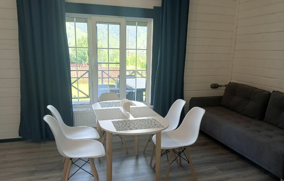 Просторные домики-студии на 2х-3х человек круглогодичного проживания. Площадь дома 20м2 + терраса 6м2. Размещение на выбор. Две односпальные кровати либо двуспальная кровать, комод, диван-кровать 1,5 местный, стол, кухонная зона (холодильник, чайник, микроволновка, посуда, столовые приборы) и санузел. Постельное белье, комплек поленец, набор для душа. В домике установлен электрический конвектор. Санузел оборудован теплым полом, электрическим полотенцесушителем, бойлером, душевой кабиной, есть фен. Так же в домике размещен телевизор с функцией smartTV, бесплатный WI-FI.