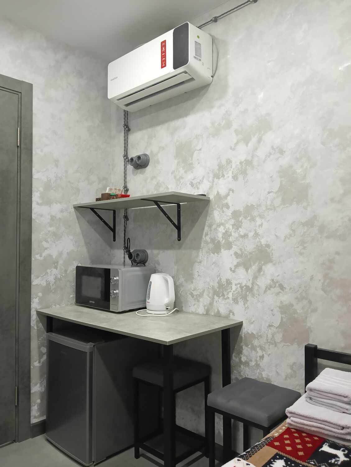 В номере: панорамные окна, кондиционер, бризер, двуспальная кровать, телевизор, отдельный санузел, небольшая обеденная зона (стол, табуретки мягкие, чайник, микроволновка, мини холодильник, посуда, набор столовых приборов). В санузле: отдельный бойлер, унитаз, душевая кабина 80х100, раковина, зеркало, фен и душевой набор.